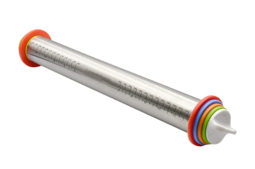 Roll dough for pies, cookies, pizzas, and more to exact proportions with the ultimate baking assistant. Our Adjustable Stainless-Steel Rolling Pin measures 17 inches long  and features four removable rings: 0.4, 0.23, 0.1, 0.08 in (10, 6, 3, 2 mm) so you can adjust your dough-rolling to a certain width and height.
