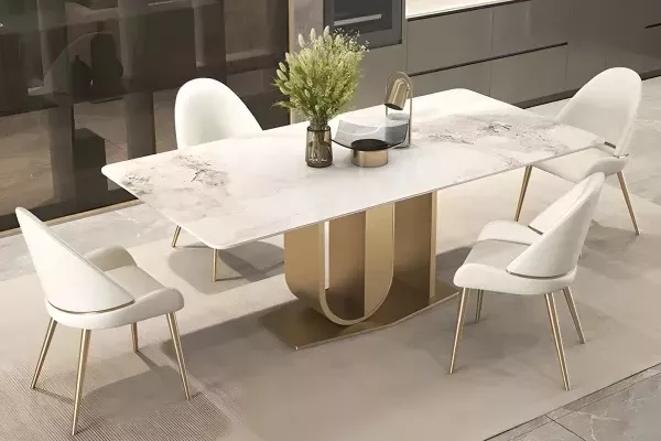 Designed with both beauty and functionality in mind, our dining table features a robust stainless steel base finished in a radiant gold that supports a sintered stone top. This top is not just a pleasure to look at but also offers unparalleled durability with its stain resistance and high-temperature threshold, ensuring that the table remains in pristine condition for years to come.