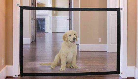 It’s easy to store since it’s flexible and takes up way less space than a baby gate. It holds back my dogs and is very easy to install onto any door or pathway.