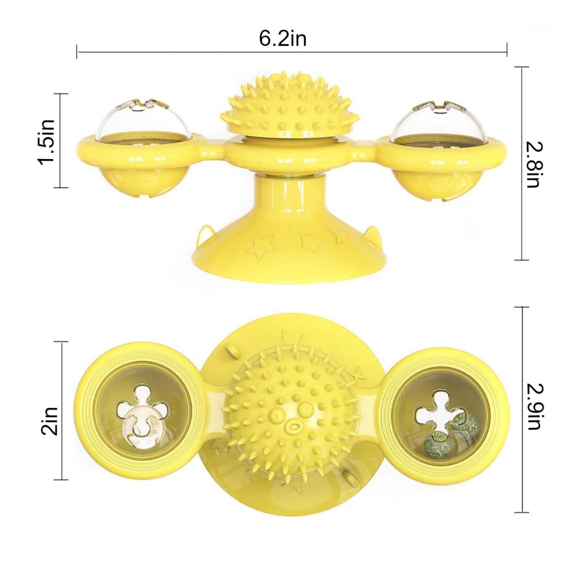 My cat just loves this toy! We have it on the window by our bathtub and she’s always running to spin the toy. She even rubs her head on the center to itch her head which she never does with other cat toys. I love the little blinking ball that goes inside one of the sides of the spinners. My cat will watch the lights blink and go back to spin the toy so they will blink again. Definitely keeps her interest and worth every penny! Highly recommend!