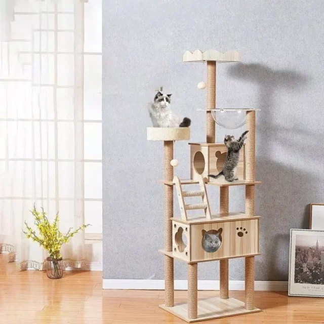 Every aspect of this cat tree has been crafted keeping in mind the playful nature and safety of your cat. The robust wooden construction ensures stability, while the natural materials provide an eco-friendly touch to your home decor.
